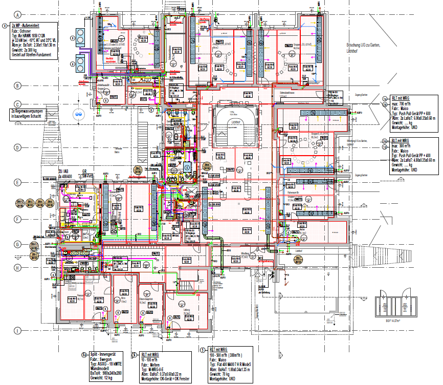 | Geplante Lüftungsgeräte | 1 wetterfestes RLT-Gerät mit 4.000 m³/h und Wärmetauscher und 30 Wohnraumlüftungen mit 600 bis 100 m³/h und WRG |