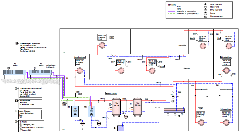 | Geplante Wärmeerzeugung | 2 Luft-Wasser Wärmepumpen mit ca. 90 kW mit 1 Puffer à 1.000Liter |