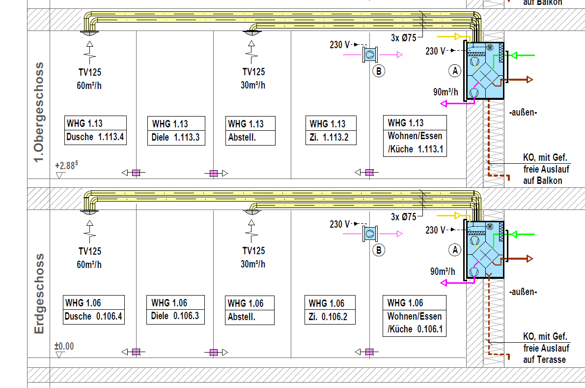 - 1 Kompakt-Lüftungsgeräte mit max 360 m³/h und WRG für die Kellerräume
